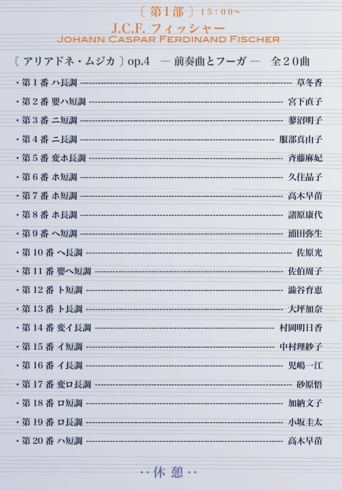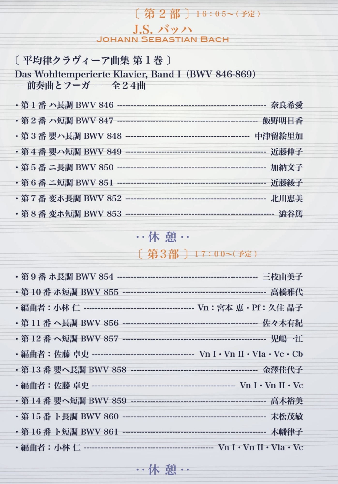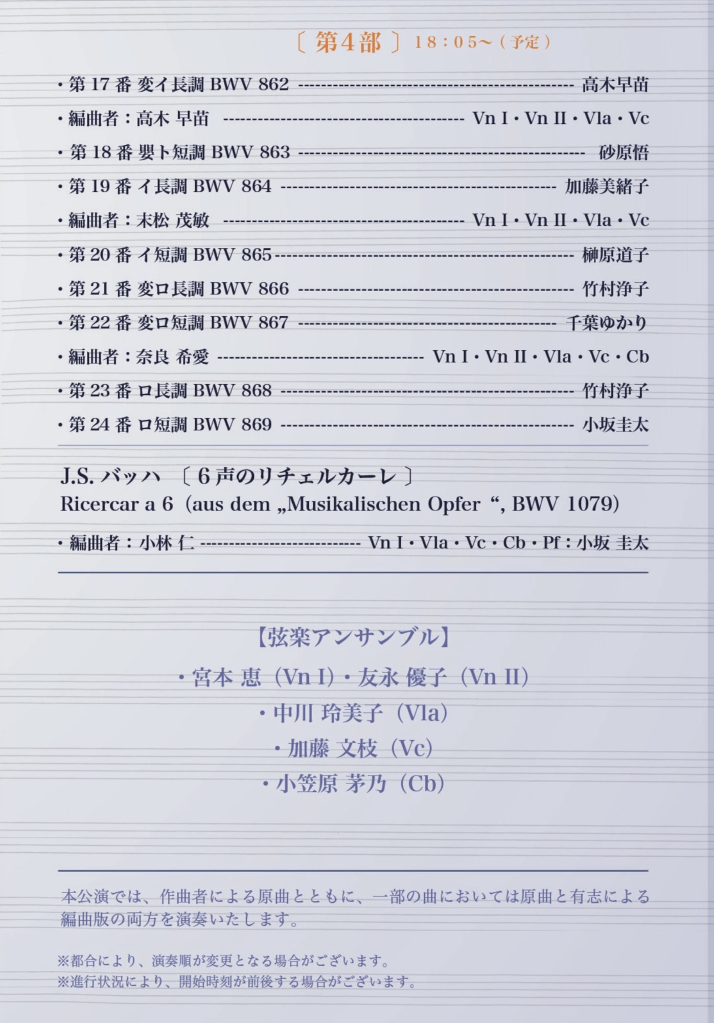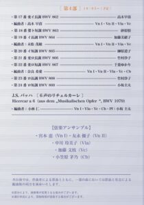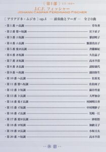 「平均律1巻を皆で弾く」だけでも楽しいのに、それだけで終わらないのが小林先生の<眼差し>ならでは。今回は、平均律クラヴィーア曲集(第1巻 1722年/第2巻 1742年)のインスピレーションとなった「フィッシャー:アリアドネムジカ(1702年)」20曲をピアノで弾いてみる企画&平均律を弦楽アンサンブルで編曲企画も加わって、豪華なコンサートになりました。